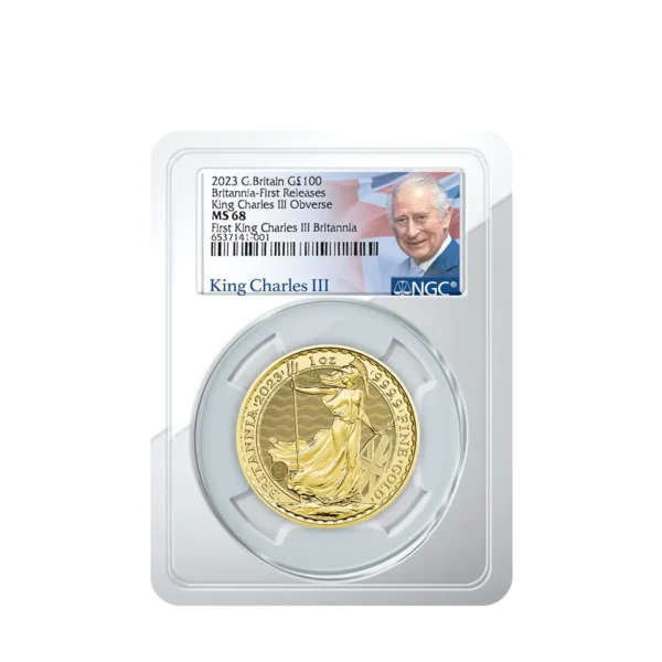 The 2023 1 oz Gold Britannia First Release is a premium bullion coin from The Royal Mint, struck in 99.99% pure gold and featuring the first official effigy of King Charles III. Graded NGC MS-68 First Releases, this coin represents near-gem condition with strong collectibility due to early release certification and high-grade preservation.