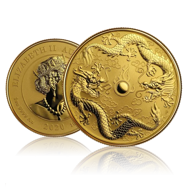 The 2020 1 oz Gold Perth Mint Double Dragon Coin is a highly sought-after bullion release featuring an intricate design of two Chinese dragons encircling a flaming pearl, a powerful symbol representing strength, wisdom, and prosperity. Struck by The Perth Mint in Australia, this coin is minted from 99.99% pure gold, offering both exceptional purity and refined artistic craftsmanship.