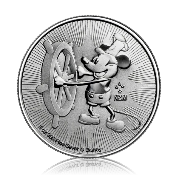 The 1 Oz Silver Disney Steamboat Willie Coin (2017) is a collectible bullion coin, produced by the New Zealand Mint and struck in 999.9 fine silver. This release celebrates Disney’s iconic 1928 animation, featuring Mickey Mouse in his classic Steamboat Willie appearance.