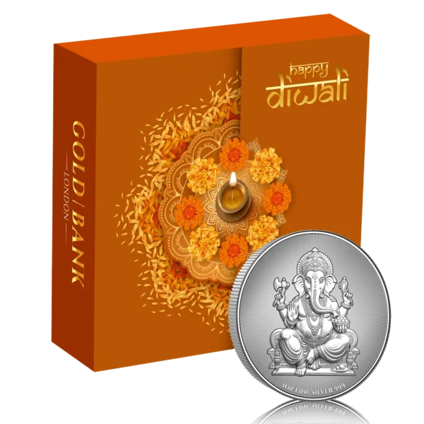 The 1 Oz Silver Gold Bank Happy Diwali Ganesha (Box Set) is a commemorative silver coin, crafted in 999.9 fine silver and designed to celebrate the festival of Diwali. This piece combines cultural significance with refined minting and presentation.