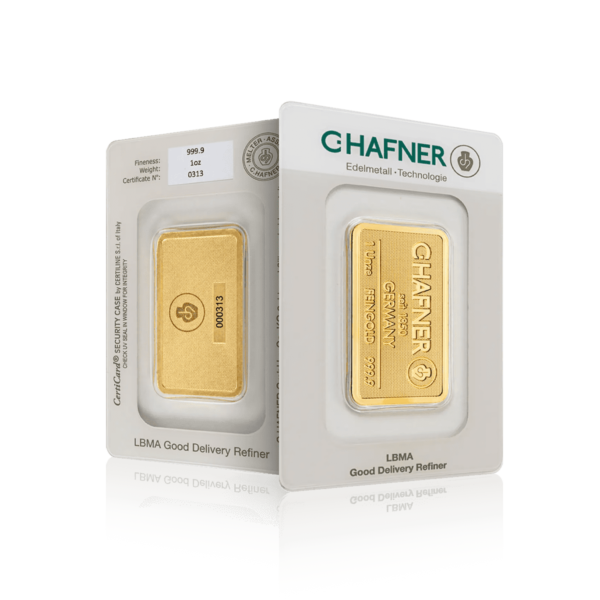 Containing one troy ounce of pure gold, this bar offers strong intrinsic value and excellent liquidity, making it a preferred choice for both investors and collectors. The bar features a clean and professional design displaying the C. Hafner hallmark, weight, and purity, ensuring authenticity and worldwide recognition.