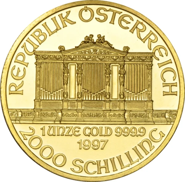 The 1997 1 oz Gold Austrian Philharmonic is a finely struck bullion coin issued by Austria and produced in 99.99% pure gold by the Austrian Mint. As part of the globally recognised Philharmonic series, it is highly valued for its elegant musical theme, high purity, and strong international liquidity.