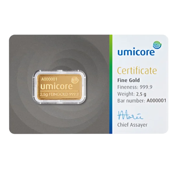 Discover the 2.5g Umicore Investment Gold Bar, refined in 999.9 fine gold (24-carat) by Umicore, one of Europe’s most trusted LBMA-accredited precious metal refiners. With a strong international reputation and commitment to quality, Umicore produces bullion that meets the highest global standards.