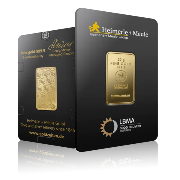 Discover the 20g Heimerle + Meule Investment Gold Bar, struck in 999.9 fine gold (24-carat) by Heimerle + Meule, one of Germany’s oldest and most respected LBMA-accredited refiners. Renowned for its precision and exceptional bullion standards, the refinery produces gold bars trusted across global markets.