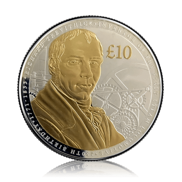 Containing 155.51 grams (5 troy ounces) of pure silver, the coin features a detailed reverse design celebrating Trevithick’s groundbreaking contributions to steam technology and the Industrial Revolution.