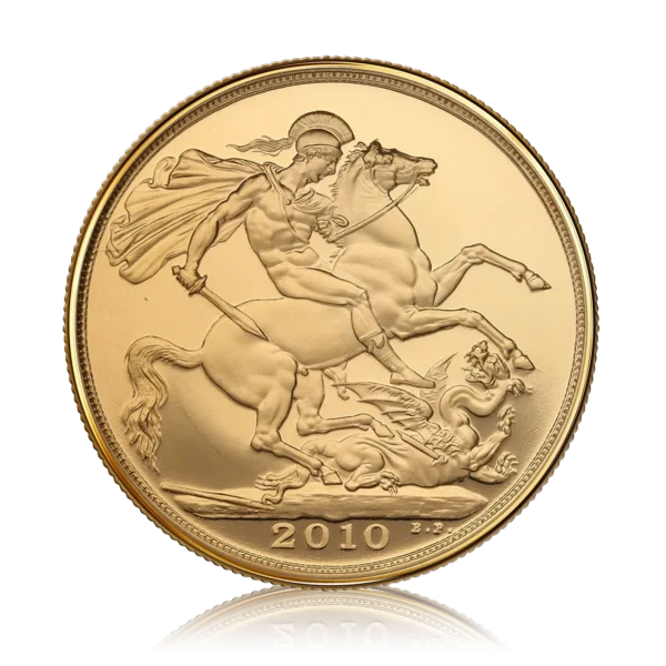 Discover the Gold Proof Double Sovereign (2010), a beautifully crafted proof coin struck by The Royal Mint in 22-carat gold. This prestigious coin showcases the legendary St George and the Dragon design by Benedetto Pistrucci, one of the most iconic images in British numismatic history and a defining feature of the sovereign series.